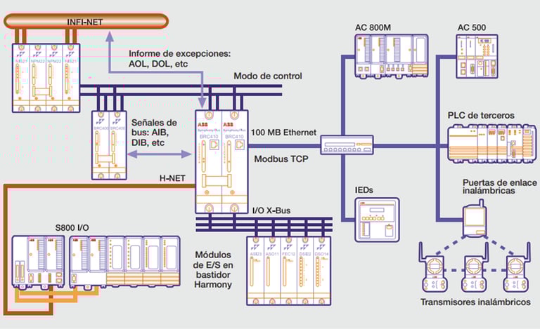 Descripción general El BRC410 aúna en un solo módulo el rendimiento y la capacidad de controlador del BRC400 con la capacidad de comunicaciones Modbus TCP del HPG800. Se puede utilizar en combinación redundante con los módulos BRC400 o HPG800, facilitando de este modo una actualización en línea de las capacidades del controlador o de la puerta de enlace del dispositivo en funcionamiento. El BRC410 con Harmony Gateway Software (HGS) permite a los usuarios de Symphony Plus actualizar las interfaces de comunicaciones serie RS232 o RS485 existentes a 100 MB Ethernet mediante el protocolo de comunicaciones Modbus TCP. Además, BRC410 ofrece capacidad y rendimiento suficientes como para fusionar las interfaces de serie múltiples en una única interfaz 100 MB Ethernet.